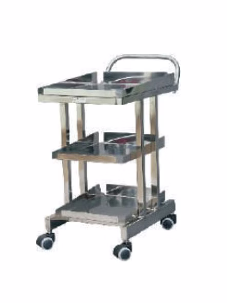 Overall size:- 580 mm L x 360 mm W x 660 mm H Three Shelves Pretreated and epoxy powder coated with stainless steel top Available in complete stainless steel with three/ four shelves 50 mm diameter wheels.