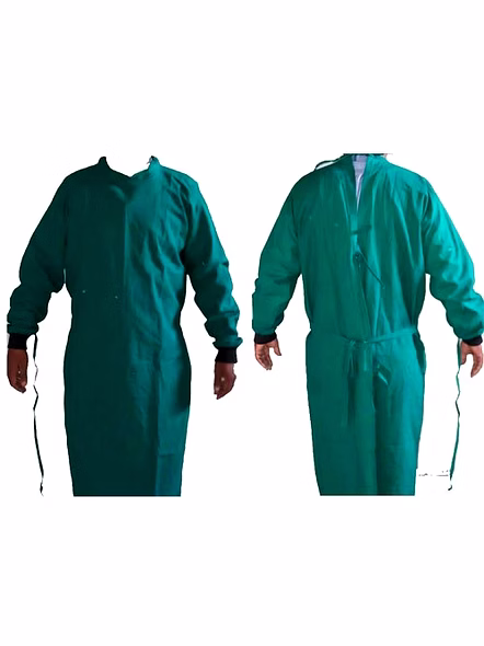 Material : Water Repellent +Pv Suiting /Cotton Color : Green Style : Double Flap – Wrap Around Size : U Length : 46” Product Code :SGPVDF /SGCTDF Specifications: • Wrap Around for Extra Protection • Autoclavable, • Black Rib on sleeves end • Extra thread for better fitting